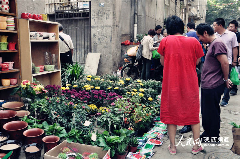 从鸟市出来,不远处就能看到人群密集的一个浅巷。靠着一栋旧楼便是一户卖花的人家,老板娴熟的修剪着花叶,十元便可买到一捧雏菊。往里走,人群中只见穿着睡衣、拖鞋的妇人也带着半赏半买的心情看着摆出的君子兰、绿萝、雏菊等植物。不一半会儿,便看到骑着自行车的、三两结伴的人们选上一盆中意的花再提着早已买好的菜,边走边拖着绵长的尾音的陕西话,伴着巷子不知名的店里放的老秦腔,向巷子外走去……