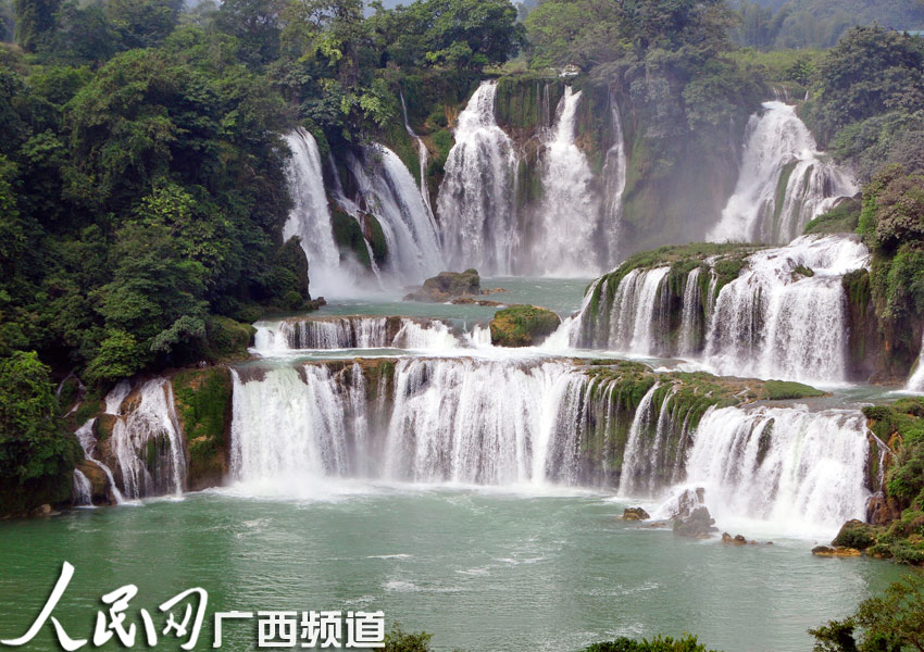 德天瀑布素绢高挂,碧水清流