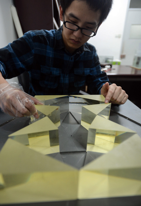 10月31日,浙江大学陈红胜教授研究团队工作人员、博士郑斌整理一件“隐身”装置。新华社记者韩传号摄