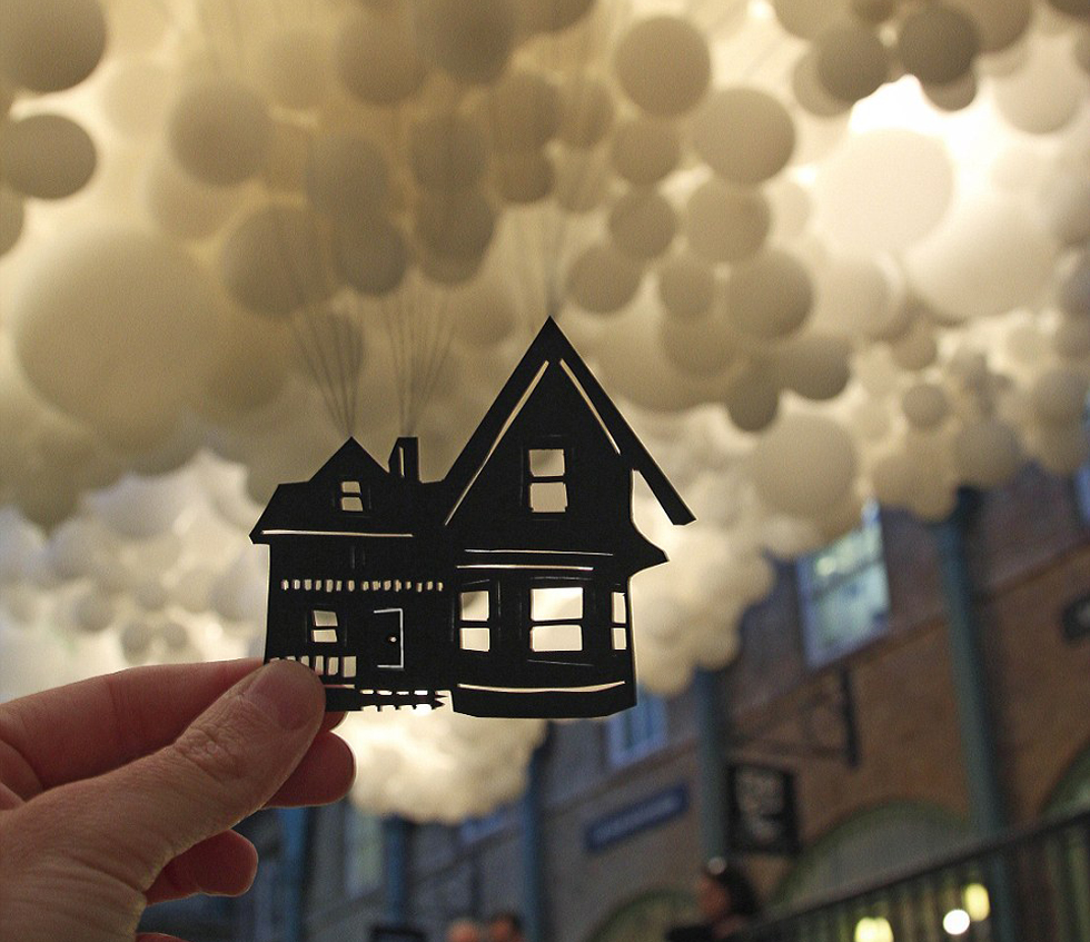 受电影《飞屋环游记》的启发,麦克尔剪出一栋房子,好像被考文特花园的气球拉上天空。(网页截图)