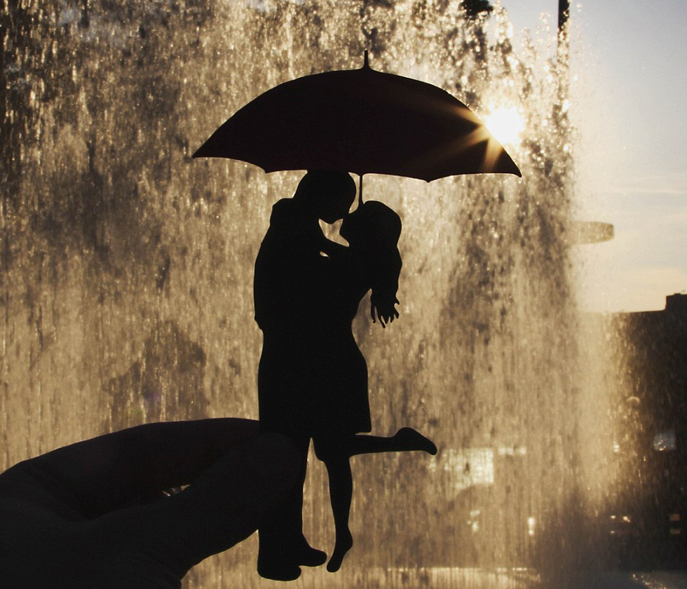 在日落时分,这对夫妇在雨中接吻的场景实际上只是麦克尔在南岸喷泉附近精心摆放的剪纸。(网页截图)