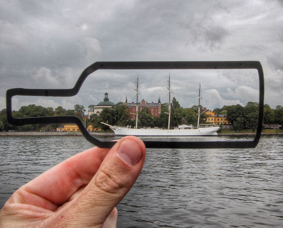 在斯德哥尔摩旅行时,麦克尔将过往的游船括入瓶子中,将自己的剪纸计划推向国际化。(网页截图)
