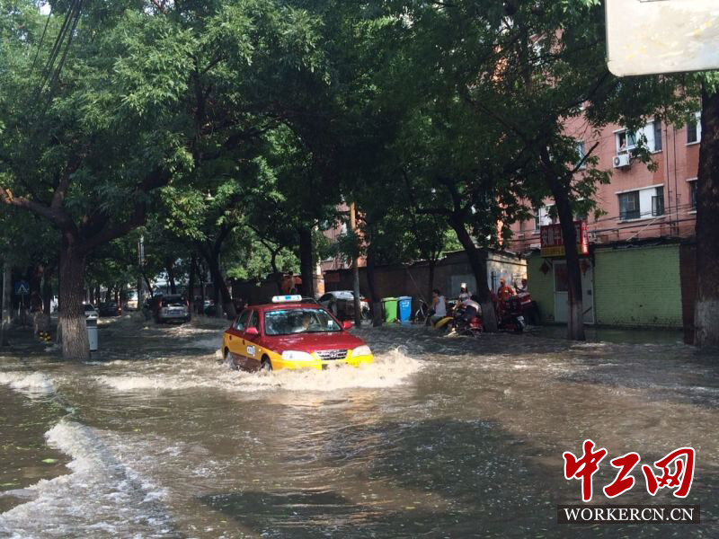 6月10日,北京午后迎来雷阵雨天气,暴雨后积水扰人,局地再现“海景”。图为在安德路“海”上行驶的出租车。中工网记者 葛文琦摄