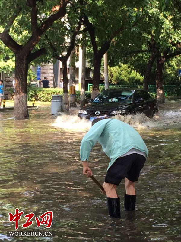 6月10日,北京午后迎来雷阵雨天气,暴雨后积水扰人,局地再现“海景”。图为“绿衣人”在疏通排水口。中工网记者 葛文琦摄