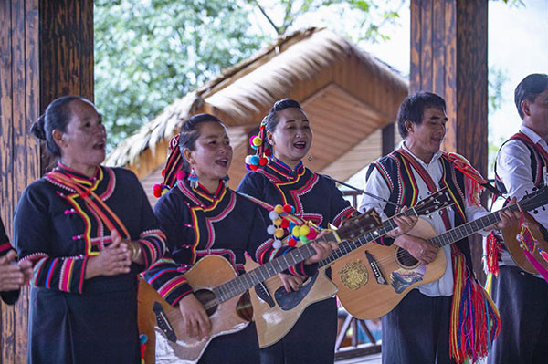 “吉祥的日子我们走到一起……拉祜拉祜拉祜哟,快乐的拉祜人,幸福吉祥,吉祥幸福,快乐到永远。”澜沧拉祜族自治县酒井乡老达保村的拉祜广场上,李娜倮和村民弹起吉他,唱起《快乐拉祜》。
