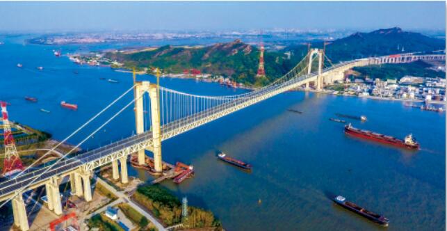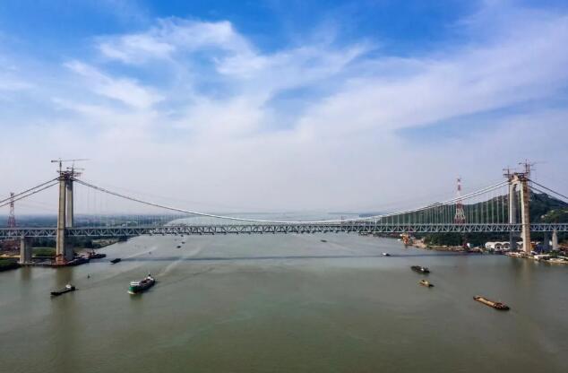 当浩荡长江奔流至五峰山脚下,宽阔的江面突然变窄,宽度仅有1200米,这是适合建桥的理想桥址,但同时也面临新的问题。由于海轮的航道和内河的航道并行使用这片水域,每天往来大量万吨巨轮,交通十分繁忙,在水面突然变窄的情况下,桥梁建设必须保障航运的通畅与安全。如果能一跨过江,就能最大限度降低桥梁对航道的影响。由于江面窄、航运忙、安全畅达要求高,统筹考虑结构受力、桥址地形条件,悬索桥是最有利、最合适的桥型。而且,相比其他桥梁结构,悬索桥能够实现大跨度、高架空、低造价,抵御地震、沉降等自然灾害能力强。