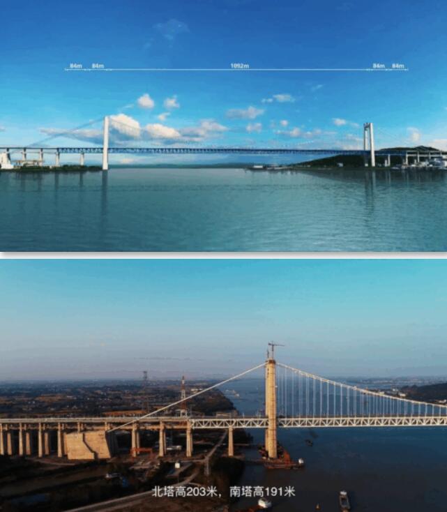 五峰山长江大桥全长6409米,其中主桥主跨1092米,南岸主塔高191米,北岸主塔高203米,是我国第一座铁路悬索桥,也是世界首座高速铁路悬索桥。在世界上率先研究建立高速铁路悬索桥的设计方案、计算理论和技术标准,在我国乃至世界铁路桥梁建设史上具有里程碑意义。