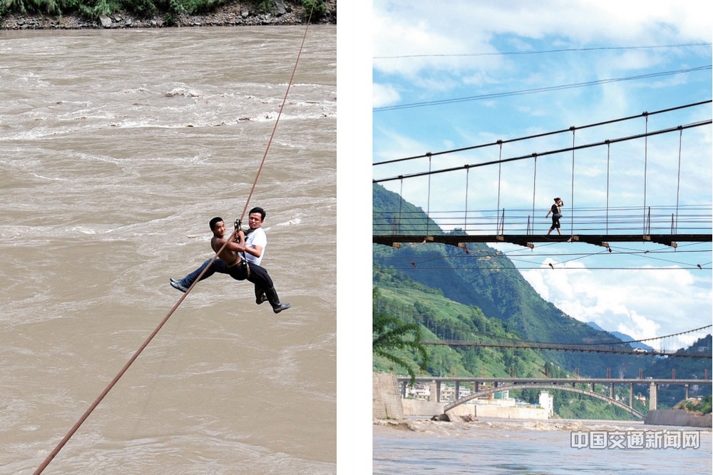 怒江上的溜索(左图)已成为历史,如今,福贡县上帕镇已建起三代跨江大桥(右图)。 特约记者 新跃华 摄
