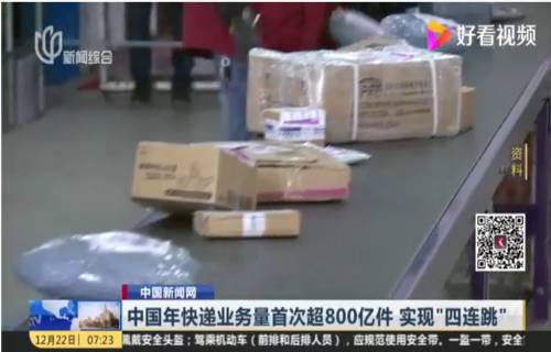 根据国家邮政局监测数据显示,12月21日,我国快递年业务量首次突破800亿件。今年我国快递业务量实现了从500亿、600亿、700亿、800亿的四连跳。透过快递年业务量这一窗口,既可以看到就业稳定、经济增长良好态势的同时,更可见中国高质量发展澎湃潮涌。