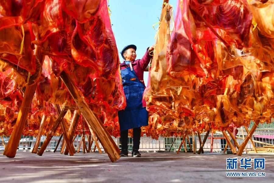 在江西省兴国县枫边乡密石村,一名村民在制作腊鸭(12月21日摄)。新华社发(陈鹏 摄)