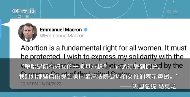 法国总统马克龙表示:“堕胎是所有妇女的一项基本权利。它必须受到保护。我想对那些自由受到美国联邦最高法院破坏的女性们表示声援。”