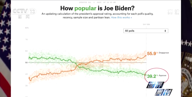 7月1日,据FiveThirtyEight政治网站公布的民调,拜登的支持率降至历史新低39.2%,已低于其前任特朗普的同时期水平。哈佛大学美国政治研究中心同日的民调显示,高达71%的受访者认为拜登不应竞选连任。