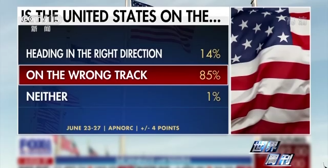 另据美联社-NORC公共事务研究中心6月末公布的一项最新民意调查显示,高达85%的受访者认为,美国正走在错误的道路上。其中79%的受访者认为美国的经济将变得更加糟糕。