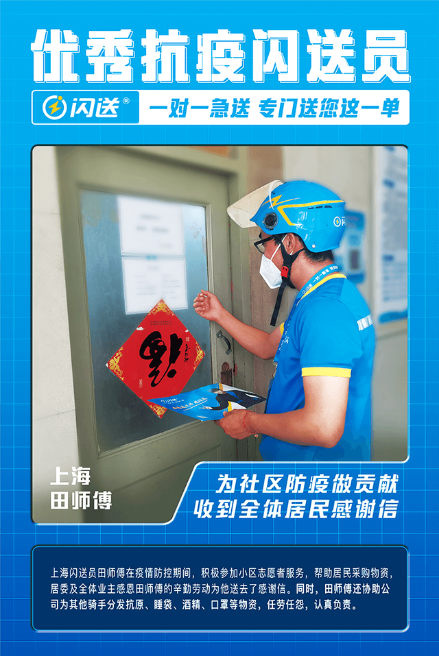 上海的田师傅就是获得表彰的优秀抗疫闪送员之一,他在疫情防控期间,积极参加小区志愿者服务,帮助居民采购物资,居委及全体业主感恩田师傅的辛勤劳动为他送去了感谢信。和田师傅一样积极参与抗疫工作的闪送员还有很多,例如朝阳的卢师傅,自发组织身边同学朋友为滞留在高速上的货车司机送水,还有吉林的王师傅,为急需物资的市民多次义务递送,以及广西的刘师傅,联合爱心商家为烈日炎炎下身着防护服的“大白”送糖水。