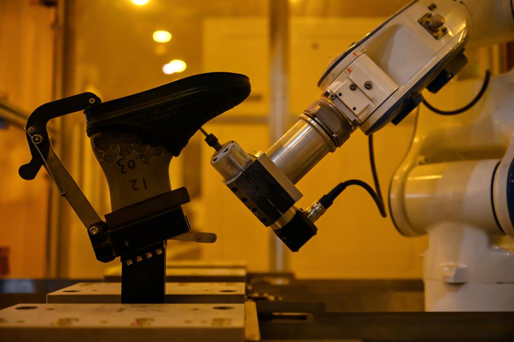 5月12日,在晋江市茂泰鞋材有限公司的智能化生产车间,机械臂在进行花园鞋自动打孔作业。新华社记者周义 摄