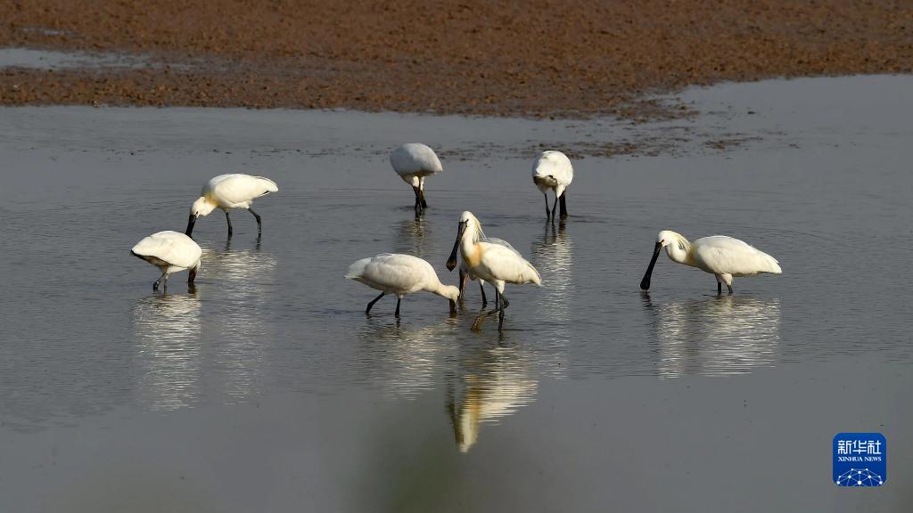 这是4月10日在河南黄河湿地国家级自然保护区孟津段拍摄的白琵鹭。新华社发(马朝红 摄)
