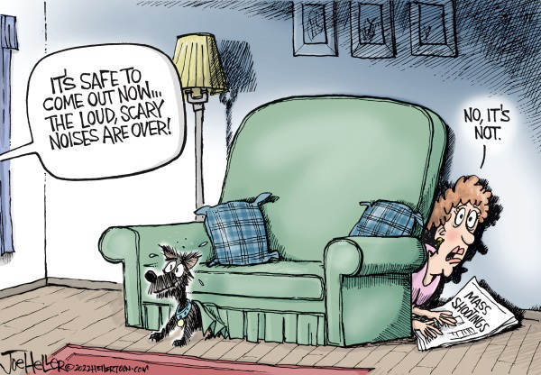 参考消息网7月10日报道 女人看着“大规模枪击案”的新闻,惊恐万分,躲在沙发后面。窗外有人报信:“现在出来是安全的……喧闹、恐怖的声音已经结束了!”但她害怕地说道:“不,还没结束呢。”(原载美国政治漫画网)