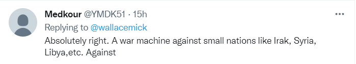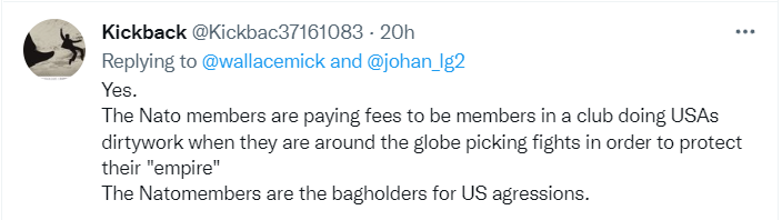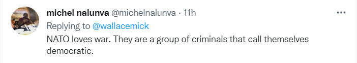 10日,华莱士以同样的视频配上不同的文字发了两条推文,配文是他在视频中讲话的节选。“北约不是一个防御联盟,而是一台战争机器,”华莱士说,“去问问阿富汗、伊拉克和利比亚人民就知道了。北约的真正目的是捍卫正在衰落的美国霸权以及一个单极世界体系,北约为此而存在。”