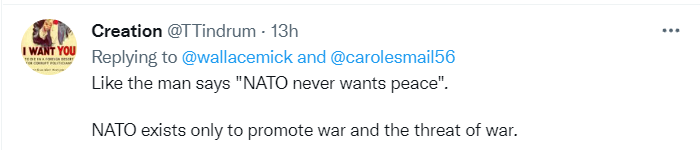 “就像这位男士所说,‘北约从未想要和平’。北约之所以存在,只是为了推动战争和发出战争威胁。”