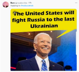 另有网友发了一张图,上面有美国总统拜登的形象,配文是“美国将与俄罗斯战斗到只剩最后一个乌克兰人”。↓
