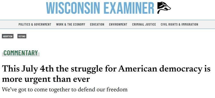 美国威斯康星考察家 (Wisconsin Examiner) 网站 发表评论文章称,今年7月4日事件(指“独立日”枪击案)表明,此刻美国对民主的挣扎渴望比以往任何时候都更加迫切。文章强调:“我们相信美国的民主是全世界最自由、最公正的。然而现如今,我们的政府系统丝毫体现不出这一根深蒂固的信念,民主制度正遭受着政治不平等的破坏。”
