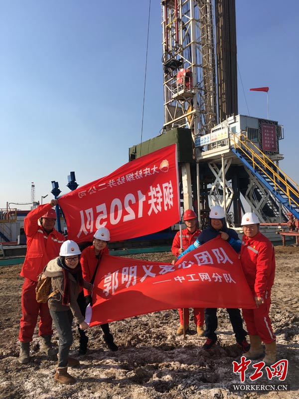 钢铁1205队第三任队长是家喻户晓的劳动模范王进喜,能够到“铁人”当年工作奋战过的队伍中感受“大庆精神”、“铁人精神”令大家感到非常兴奋和激动。参观结束后,分队成员在寒风中和1205队成员,及全国劳动模范杨海波一起合影留念。