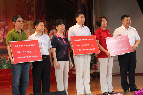中国社会福利基金会副秘书长李忠勤(左3)为接受爱心企业家向授渔基金捐款。