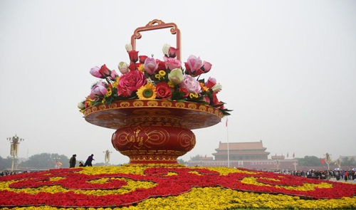 人民网北京9月26日电(沈宇波) 25日,天安门广场中心高达15米的“祝福祖国”主花坛正式完成吊装,开始供游客参观。据悉,今年国庆花卉布置采用西式插花,首次使用了3D打印技术,花坛造型更加丰富逼真,天安门广场中心15米高的“大花篮”可抵御10级大风。