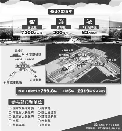投资近800亿元的首都新机场近日开工建设,新机场定位为大型国际航空枢纽,规划建设7条跑道,满足年旅客吞吐量1亿人次需求;工期五年,计划于2019年建成投产。由于新机场位于北京市大兴区榆垡镇、礼贤镇和河北省廊坊市广阳区之间,对首都经济圈和京津冀发展的影响吸引了多方关注。