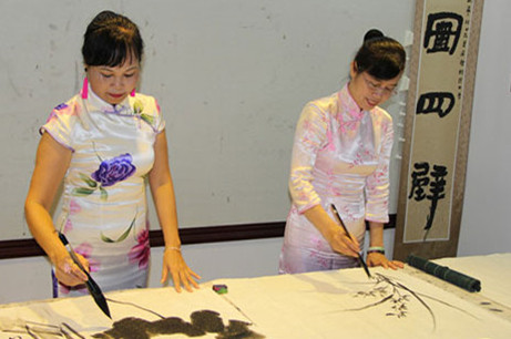 书画艺术家郑莉、吴惠珍身着旗袍服挥毫泼墨