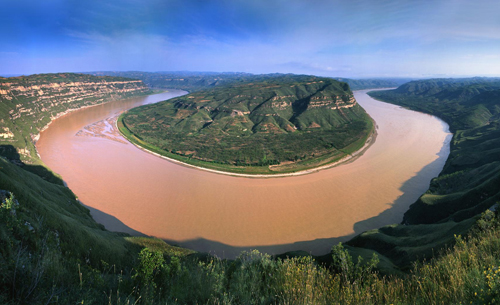 黄河“乾坤湾”位于山西省永和县和陕西省延川县的晋陕峡谷中,在山西省流经永和县68公里,自北而南形成7个大湾。这里,山抱着河,河绕着山,宛然一幅山水和谐共生的立体“太极图”,形成了中国河流中规模最大、最完好、最密集的蛇曲群,被专家称为“黄河上最美的湾”。2011年11月,国土资源部正式批准山西永和黄河蛇曲国家地质公园,并进入第六批国家地质公园名录,乾坤湾被列为“十二五”期间山西省11个重点建设景区和五条精品旅游线路之一。