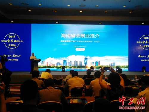 中工网讯 5月18日,由海南省商务厅主办,国旅海南文化传媒公司承办的“2017海南(北京)会展业推介会”在北京国家会议中心举行,海南省商务厅副厅长兼省会展局局长李龙生出席推介会并致辞,海南省会展局李学锋副局长主持推介会。海南省会展业、北京当地企业、协会、公关公司等共200人参加本次推介会。推介会旨在宣传海南会展业的政策和资源,进一步扩大海南会展的对外吸引力和影响力,吸引会展买家来海南洽谈考察。