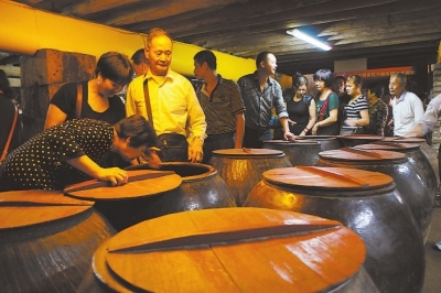 “酿醋先做酒,发一个星期做成红曲酒,酒做好后,经过过滤,再在醋缸里陈酿。”她说,“‘醋宝宝’可不好养,它是‘吃’芝麻的,我们得每天往缸内添加芝麻;它‘喝’的是米酒头,工人们也要适时添加。它们的生存环境需要保持22到23摄氏度的恒温,所以我们的地面使用能保持温湿度泥沙土;酿醋的水也是很关键的,需要地下80米以下抽出的井水。工人还要每天来搅拌两次,用白糖炒制后调色。”参观结束,游客们还能免费品尝新鲜调制的醋饮料。