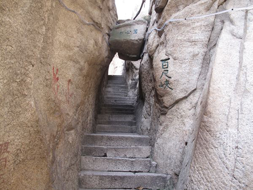 “幢去峡复来,天险不可瞬。虽云百尺峡,一尺一千仞。”过千尺幢向北折即到“百尺峡”,它是登华山的第二个险境。“百尺峡”也叫“百丈崖”,仍是一处危石耸峙,直插云表,令人望而生畏的地方。峡的两壁欲合,却被飞来的两颗石块从中撑开,人从石头下钻过,胆战心惊,生怕石块从两壁间掉下来,这就是“惊心石”。通过此石悬着的心才放下来,再回头看原来此处卡着的两块石头,是上大下小故能安然无恙,所以这颗石头也被称之为“平心石”。故韩愈诗中有“俄然神功就,杀气见棱角”的描写。