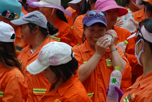每年的伏天 ,我所领导班子成员都要亲临一线为保洁员送冰镇矿泉水和防暑降温药品。图为收到慰问品的环卫工与同事笑谈。(作者 秦德才)