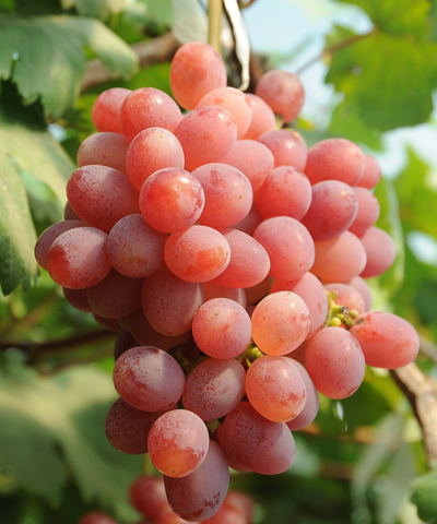 红巴拉多:早熟品种,欧亚种。该品种树势中强,发芽分化好,丰产性强,易栽培管理。色泽鲜艳,果粒晶莹剔透,皮薄肉脆,果穗圆锥形,穗重500 g以上,果粒椭圆形,单粒重9~12 g,含糖量高,充分成熟可达22%以上,品质极佳。