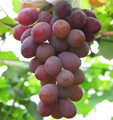 巨玫瑰果穗中等大,穗重400~6。0—0 g,果粒椭圆形,鲜红色,果粉中等,果肉较软,昧极甜,有浓郁的玫瑰香味,可溶性固形物达20%以上。