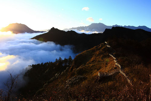登上高山区海拔3310米的红石尖,巨大的红色花岗岩石峰,恰似天然的观景台。伫立台上,向西眺望大雪塘,气势磅礴,银光灿烂,在浩瀚的蓝天衬托下,犹如玉龙横亘天际。每当旭日东生之时,朝阳把洁白的雪山染成金黄色,"日照金山"奇观遂成为景区一绝。向东俯瞰,一望无际的成都平原隐现于轻烟薄雾之中,似一幅绝妙的泼墨山水画,山间白云缭绕,脚下绝壁千仞,给人以神奇、原始、古朴的感受,仿佛置身于神话世界。