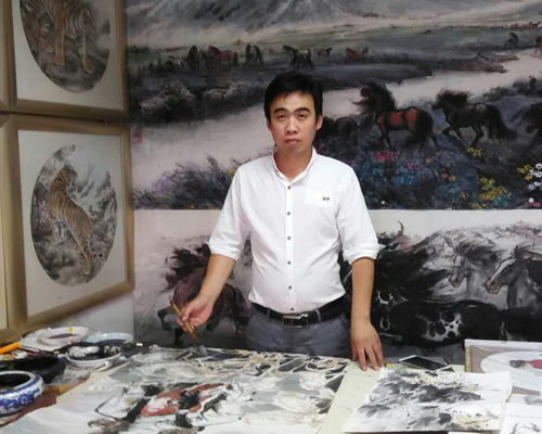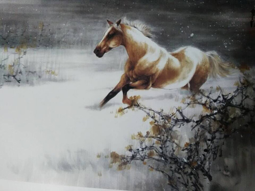 擅长画工笔传统,现代花鸟,人物,动物,尤其擅长画工笔马,毛片细密,体态神骏,补景亦雅丽工致,自由自在,徜徉在山林,幽谷,清泉,浓荫之间,或立,或卧,或躺,皆骏丽异常。