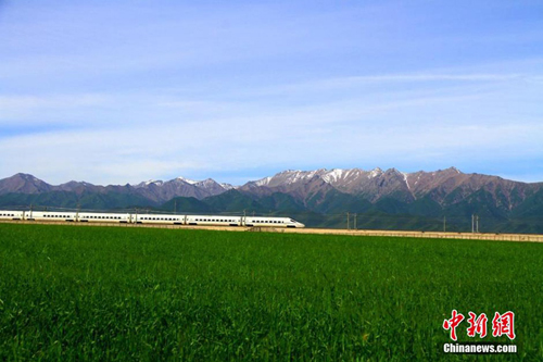 时值七月,兰新高铁动车经过的甘肃民乐、山丹军马场、青海门源、大通等地,沿线上百公里数百万亩油菜花盛开,列车飞驰穿梭在蓝天碧水、油菜花海之间,被誉为最美高铁线路。中新社发 成林 摄