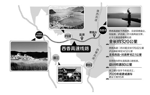 记者了解到,西香高速公路起于西昌市,沿途穿磨盘山,经盐源、泸沽湖,过川滇两省交界,止于云南省香格里拉县。全长约320公里。