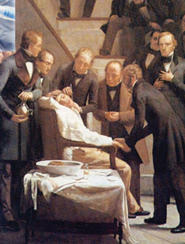 本图中是乙醚麻醉技术的早期应用,他们宁肯不要消毒,不要防护,也要首先保证不疼痛,不恐惧。
