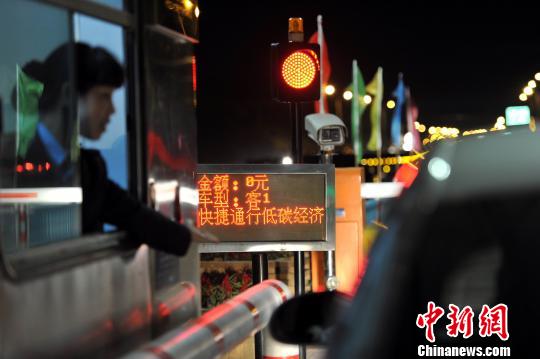 图为一辆小轿车免费通过江西高速公路一收费站口,显示屏上显示金额为“0元”。(资料图) 刘占昆 摄