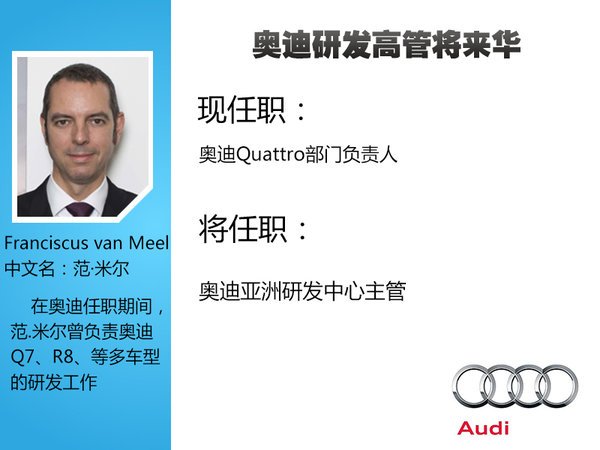 进入今年以来,奥迪品牌旗下人事变动不断,旗下研发高管与设计总监双双进行更换。这其中,现奥迪Quattro部门负责人范·米尔(Franciscus van Meel)将离开现有职位。据了解,范·米尔将被派往中国担任奥迪北京研发中心的主管,这一任命有望于今年3月正式公布。在任职Quattro部门负责人之前,范·米尔曾在奥迪公司负责Q7、R8等车型的研发项目,多年的研发经验将帮助奥迪亚洲研发中心更加快速的发展。