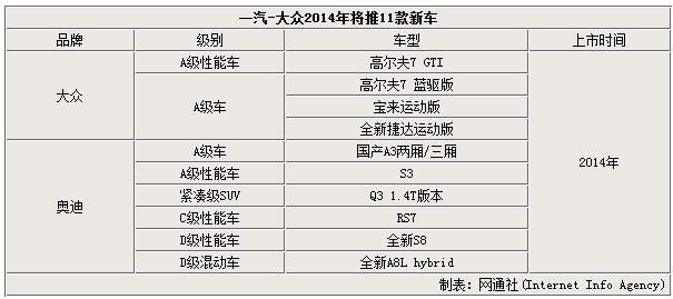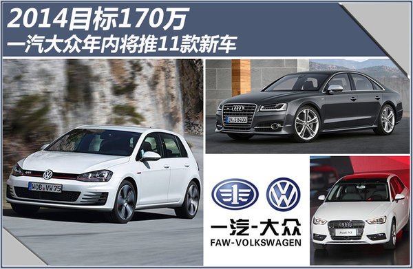 在2013年,一汽-大众国产车型销量达到1,526,288辆,同比增长18.4%。在进入新的一年后,一汽-大众于近日公布了今年的销量目标。一汽大众汽车有限公司总经理张丕杰先生近日在接受采访时表示:“对一汽大众来说,150万辆是一个基础,也是我的一个新起点,我们期待2014年是170万辆。”在设定新目标的同时,一汽-大众今年将在华投放多款新车。网通社在整理相关资料后获悉:一汽-大众旗下的大众与奥迪品牌,两者预计今年将投放11款新车,其中包括高尔夫7 GTI以及国产奥迪A3等。