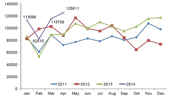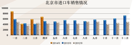 4. 2014年1月—4月北京累计交易进口车25300辆,同比去年19300辆累计增长31.09%,高于新车水平30个百分点。占京城新车交易总量13.43%。