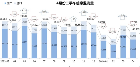 1. 2014年4月份北京成交过户二手车64000辆,同比增长-1.54%,环比增长2.4%。2. 2014年4月份京城二手车外迁率37.5%,新旧车交易比例1∶1.33,二手车交易量超过新车销量32.5%。