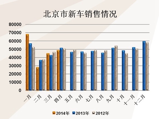2. 2014年1月—4月北京累计交易新车188400辆,同比去年186500辆累计增长1.02%,低于全国平均水平8.05个百分点。