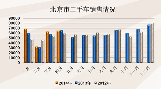 3. 2014年1月—4月北京累计成交过户二手车226300辆,同比去年211600辆累计增长6.95%,增幅高于新车5.93个百分点,二手车超过新车销量20.12%,新旧车交易比例1∶1.2。