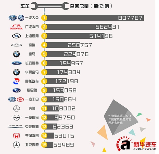 数据来源:国家质检总局网站根据国家质检总局网站公布的召回信息,新华汽车整理出2014年度主要车企召回车辆的数据。通过对数据的汇总,得出排名前十五的车企,分别是:一汽大众、广汽本田、上海通用、奇瑞、宝马中国、长安福特、华晨宝马、神龙汽车、斯巴鲁、一汽丰田、奔驰中国、一汽海马、克莱斯勒、东风本田、北京奔驰